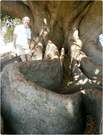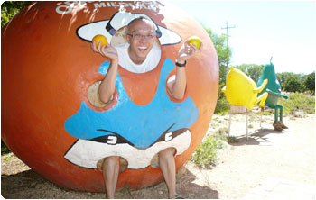オーナーはそれこそ太陽を浴びて育ったオレンジみたいな人で底抜けに明るいし、ものすごく居心地の良い場所でした。なので、ツアーが終了した後も、追加でオレンジジュースを購入して、2人でガブガブ飲んで、心行くまでまったりしてしまいました。すると、オーナーがもぎ立てのオレンジを1つずつプレゼントしてくれた!嬉しい〜〜!なので、それを両手に持って、入り口にあった個性的なオブジェに入って記念撮影。ここは来て良かった!