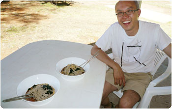一旦キャンプ場に戻って、これだけは食べておかないといけない!と持って来た、恒例の年越し蕎麦。昨年のキャンプ場は寒かったのであたたかい蕎麦を作りましたが、今回はこの40度超えの中、熱い蕎麦をすする気にもならないので、冷やし蕎麦を作りましたよ〜。具はわかめと揚げ玉のみ。あぁ、気が済んだ。