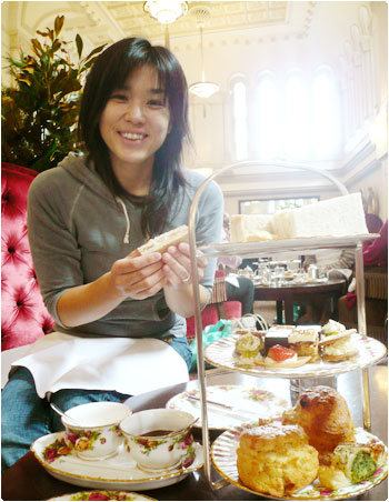 TEA ROOMに到着。ヒャーー!!これは素敵だ!!この天井の異様の高さは何だ!!店員さん達の丁寧さも素晴らしい。そして、お目当てのハイティーを注文すると、一人ひとつのスタンドを想像していたのに、ひとつのスタンドに2人分盛られて運ばれて来た。小市民な私たちは、「考えてみれば、これで2人分で60ドルって事だよねー。そうは見えないね。」なんてヒソヒソ・・・。