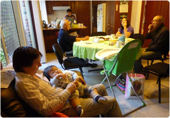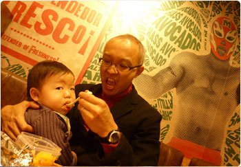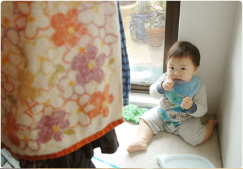 ハイチェアに賢を座らせて離乳食をあげていたら、通る人たちにたくさん声を掛けられたなぁ・・・。通りすがりに頭をなでて行く人とか。こうやって知らない人達にたくさん可愛がってもらった記憶は、本人が思い出せなくても、賢のどこかに残るのかなぁ。残ると良いよなぁ。