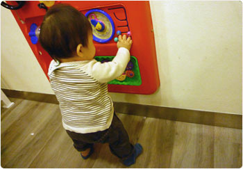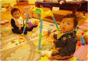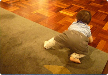 ギャー!なんて喜んでいると、絶妙なタイミングでマイケル帰宅!「ハイハイしたよ!!」と言うと、マイケルも大興奮!『馬ににんじん』ならぬ、『賢にジャラジャラした鍵』で、目の前にちらつかせると、うわ〜〜〜!前に進んでるよ!!!上手に手足を右左出して!!毎日自主トレに励んでいたのは知ってるからね。よく頑張った!!これで動けないもどかしさが少し無くなるね(最近はむしろ立ちたがってるので)。とにかく良かったねぇー。