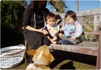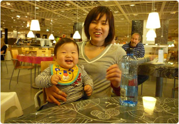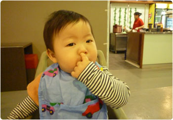 お昼をゆっくり食べるために、ちょっと早く行って、先に賢にご飯をあげておきました。カフェの革のソファに座ってくつろぐ賢。ニヤニヤしているので、その視線の先を追うと・・・。高校生のグループがニコニコ笑って賢の事を見ていました。「キャーー!ベイビーが食べてる!食べてる!!」とか、「見て!笑ってる!!」なんて大騒ぎでしたよ。良かったねぇ、賢。