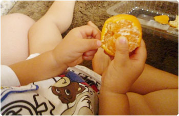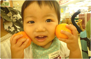 今のブームは『温室みかん』です。最初は握りつぶしてしまっていたのに、最近は丁寧に皮をむいて食べるようになりました。中の房も上手に小分けにするのよねぇ。こんな力加減までできるようにねったのねぇ・・・。日々成長だね。