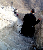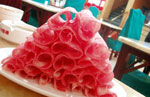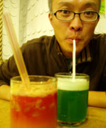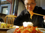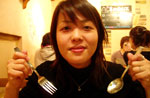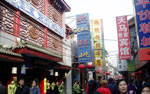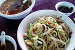 で、近くにある"炸醤麺ならここ!"とガイドブックにあった『老北京炸醤麺大王』へ。いつもはマイケルが一緒で中国語を助けてくれるだけに、かなりドキドキ。いきなり店員さんに何やら色々と言われ、なんとなーく『韓国人?』と聞かれているのは分かったんだけど(ハングオレン?と言っていたので。なんかハングルっぽい響きだな?と)、英語で日本人だと言っても通じなくて、モゴモゴ。すかさず持っていた本で調べたら、日本人はリーベンレンだったので、オシ!と思ったら、次にオーダーを取りに来たお兄ちゃんにも、"韓国人か?日本人か?"と聞かれた。今回は分かったので、日本人だという事を伝えられた。で、勝手にオススメの炸醤麺をオーダーされ、私は酸辣湯が食べたかったので、それも頼んだ。運ばれて来た炸醤麺にソースを掛けていたら、横で1人でご飯を食べていたオバさんが何かを言っている。「マーラ!マーラ!」と言っており、私の頭に「麻辣!麻辣!」という漢字が浮かんだ。あ、掛け過ぎだよ!って言っているんだと思い、"OK!謝謝!"なんて笑顔で返したら、オバちゃんのトークスタート。私に????マークが出まくりなのに、ちっともめげない。正直、酸辣湯はかなりキツい味で、オエーなんて思っていたら、オバちゃんは「プーハオツーマー」と言っていて、あ!それって『おいしくないでしょう?』じゃない!?と思って、早速本で調べたらそうだったので、激しく頷いてしまった。