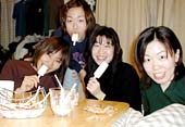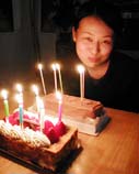 けっこう遠かったんだけど、トコトコ帰って来て、家に着いたのはもうすでに朝7時近く。私が用意したトップスのケーキとやなぎーがもらってきたマキシムのナポレオンパイのダブルケーキでろうそく消し。いやー、贅沢だねぇ。