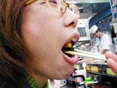 いやー、また寿司。でも毎日でも歓迎さ。モモちゃんオススメのお店があるっていう事でシズカちゃんと3人で、女だらけの回転寿司。私はまん中に座っていたので、↑こんな感じになっちゃった。寿司を食べてる人は顔も魚になる事発見。(シズカちゃんごめん。あまりにおいしくて…)