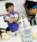 今日は菊っつぁんのバースデイ。パルコの雑貨屋さんで、これしかない!と思って震えたプレゼントを。ロボットのMr.ロビーは、目覚ましなんだけど、付属の鉄砲で打たないと止まらないのよ。スカーっと寝てて目覚ましが鳴ったら、いきなり枕元にある銃を手にして打つなんて最高におかしいでしょ。その姿を想像して迷わず購入したさ。オシャレな雑貨屋さんだったから、イギリスかなんかの輸入物と疑わなかったのに、箱に思いっきり『ロビーは一度じゃ止まらない』と斜体で書いてあった・・・。ショック。でも、菊っつぁんに喜んでもらえてよかったよーーー。