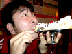 2002.12.29 二日酔いの人もいつつ、わらわら起きて近所の『サービス過剰』なラーメン屋へ行く。ラーメンはさっぱりしてて好きなんだけど、おかしなラーメン屋なんだよな。「ラーメンへのサービスは、ウーロンハイかカラオケ1曲。後もう1つはなんだっけ。忘れちゃった。」って何だ!?結局もう1つはコーヒーで、みんなそうしてもらったんだけど、訳分からん!オモろ過ぎです。